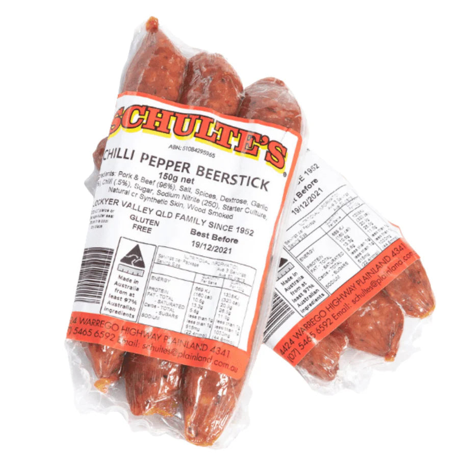 Schulte's wood smoked beersticks are a perfect snack with a delicious mix of pork and beef sausages smoked with a dash of chilli to spice up your taste buds.