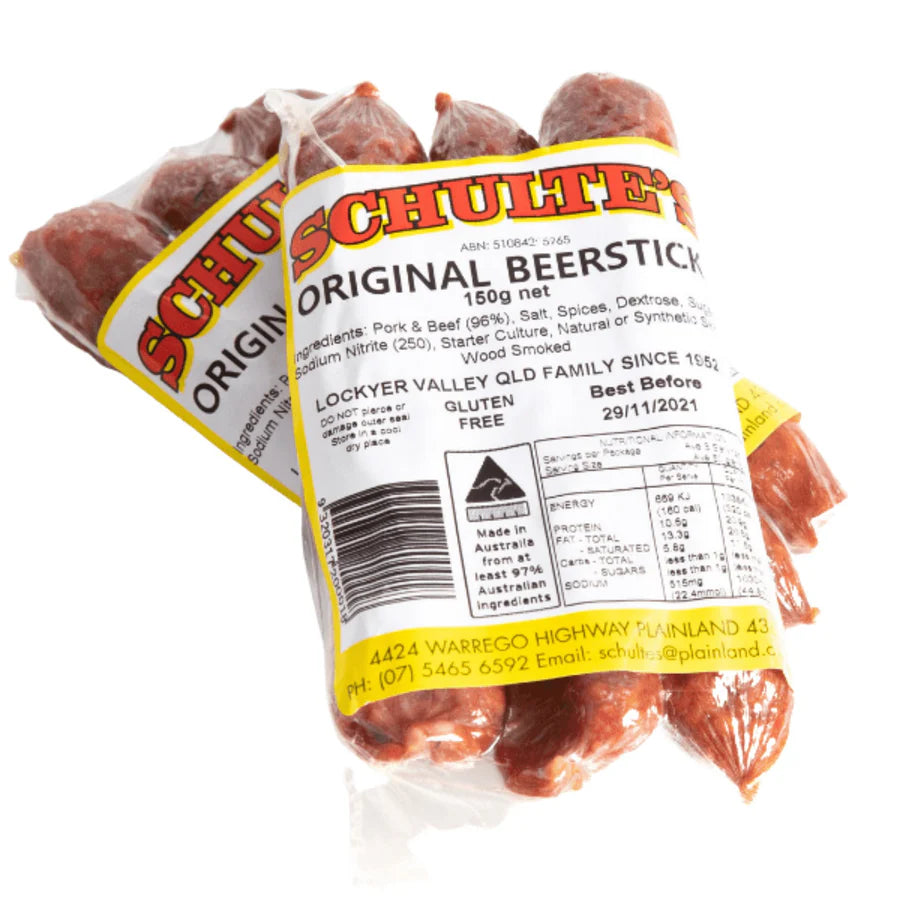 Schulte's wood smoked beer sticks are a perfect snack with a delicious mix of pork and beef sausages smoked to perfection.